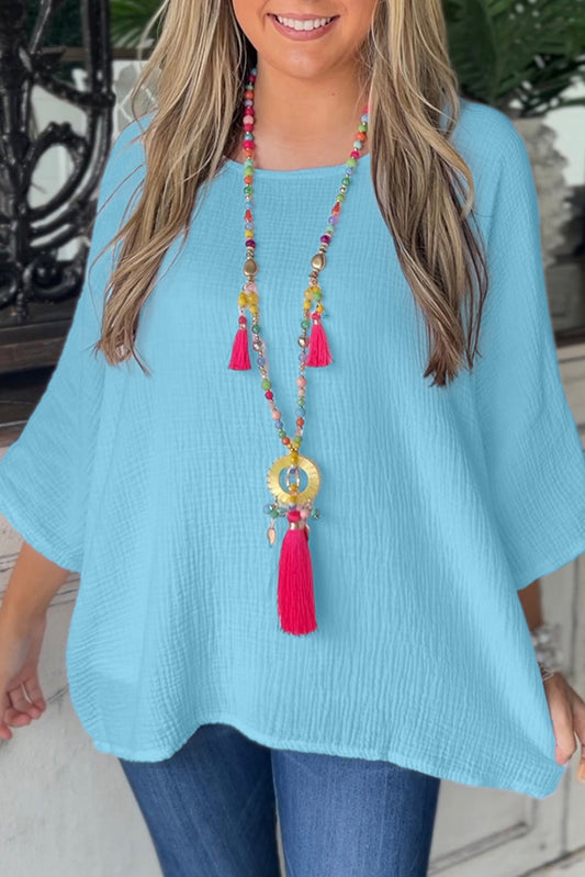 Aruba Blue Crinkled Bracelet Sleeve Flowy Blouse