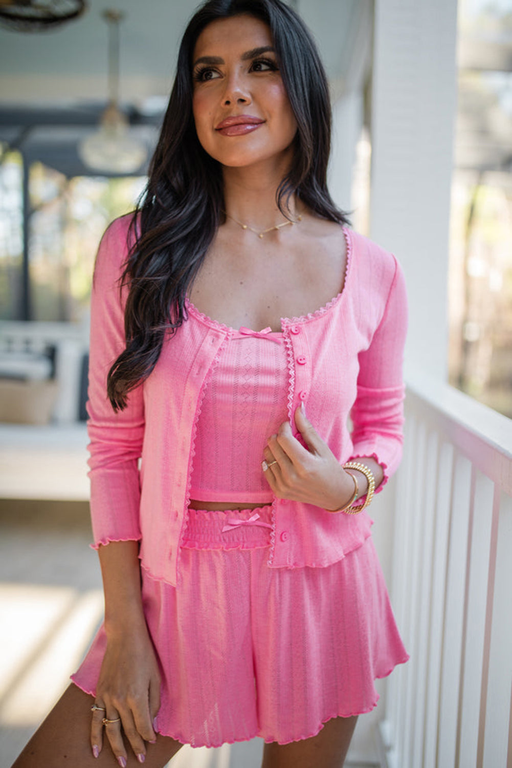 Bonbon Delicate Texture Cropped Cami Shorts and Cardigan 3pcs Lounge Set