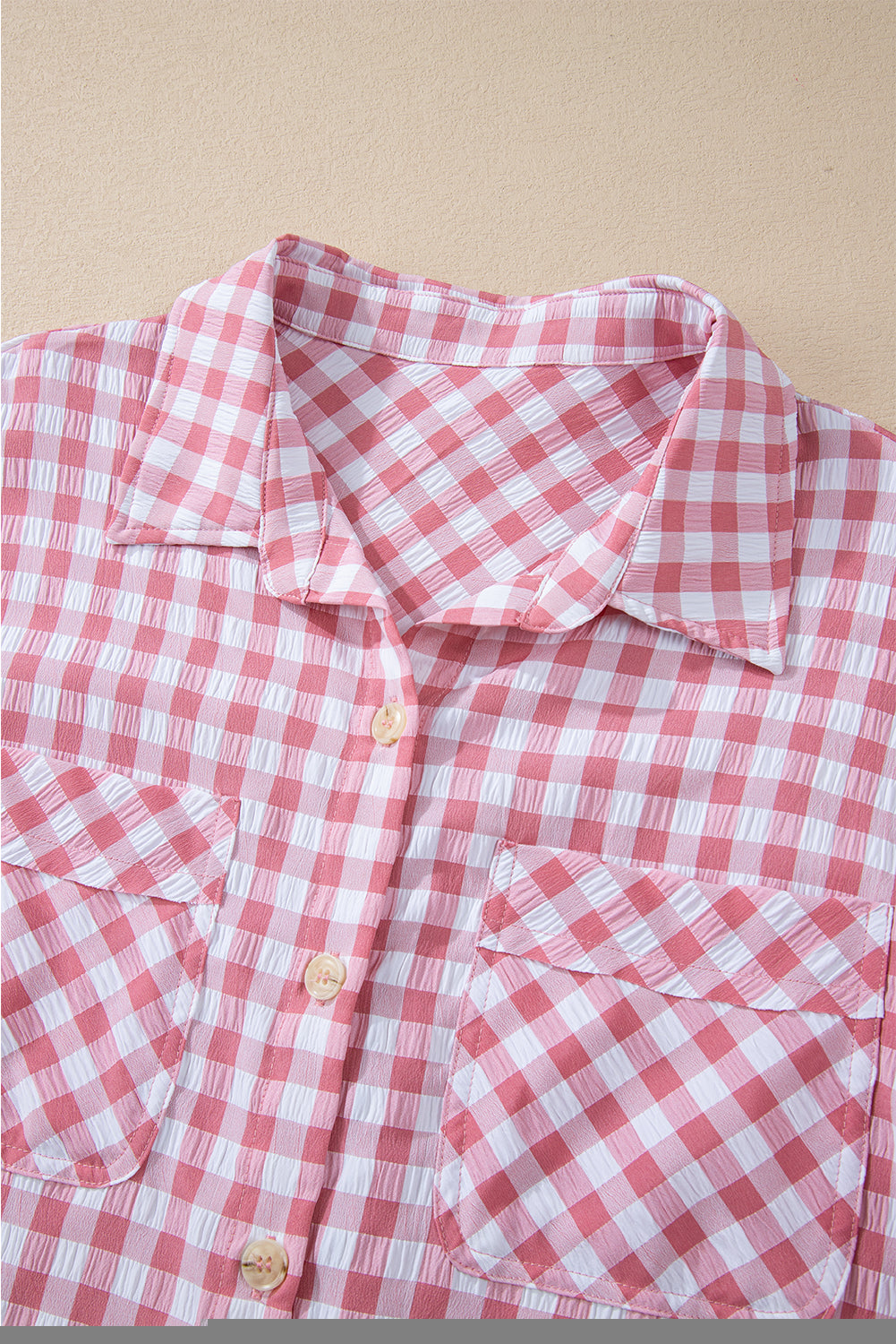 Pink Gingham Print Chest Pockets Buttoned Collared Shirt