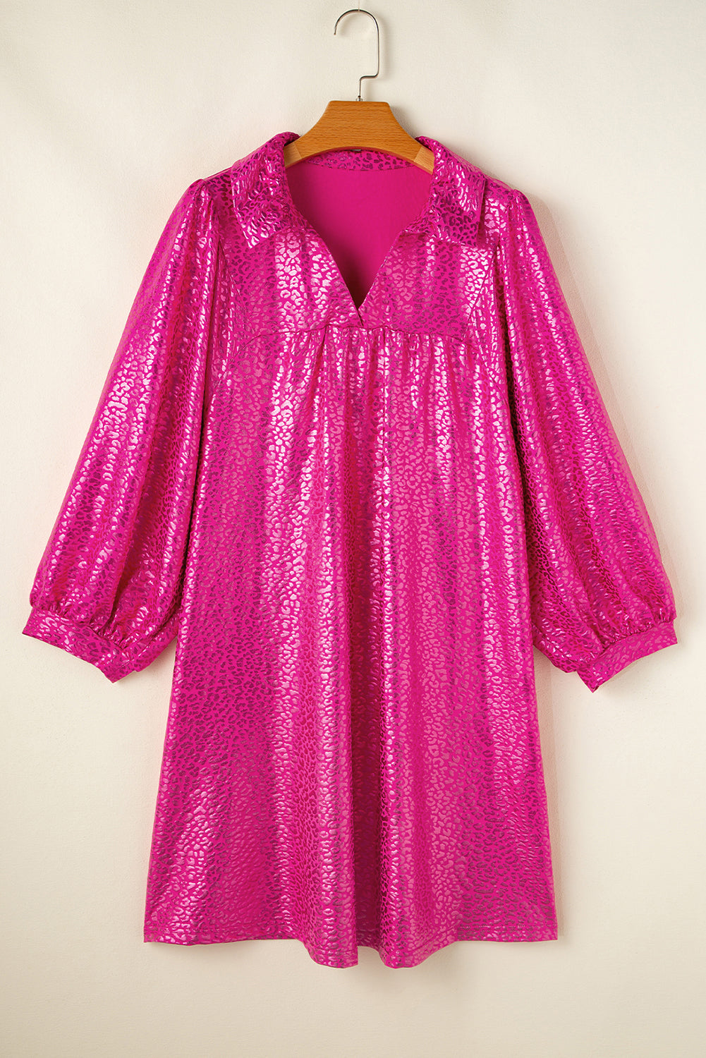 Rose Red Metallic Leopard Print Collared Babydoll Mini Dress