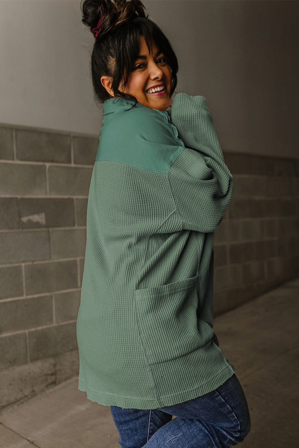 Smoke Green Waffle Long Sleeve Collar Half Button Loose Top