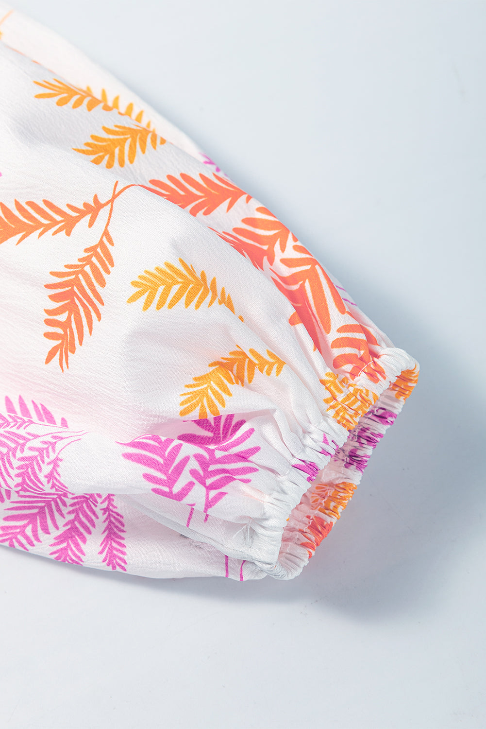 White Tropical Leaf Printed Patchwork Sleeve Round Neck Top